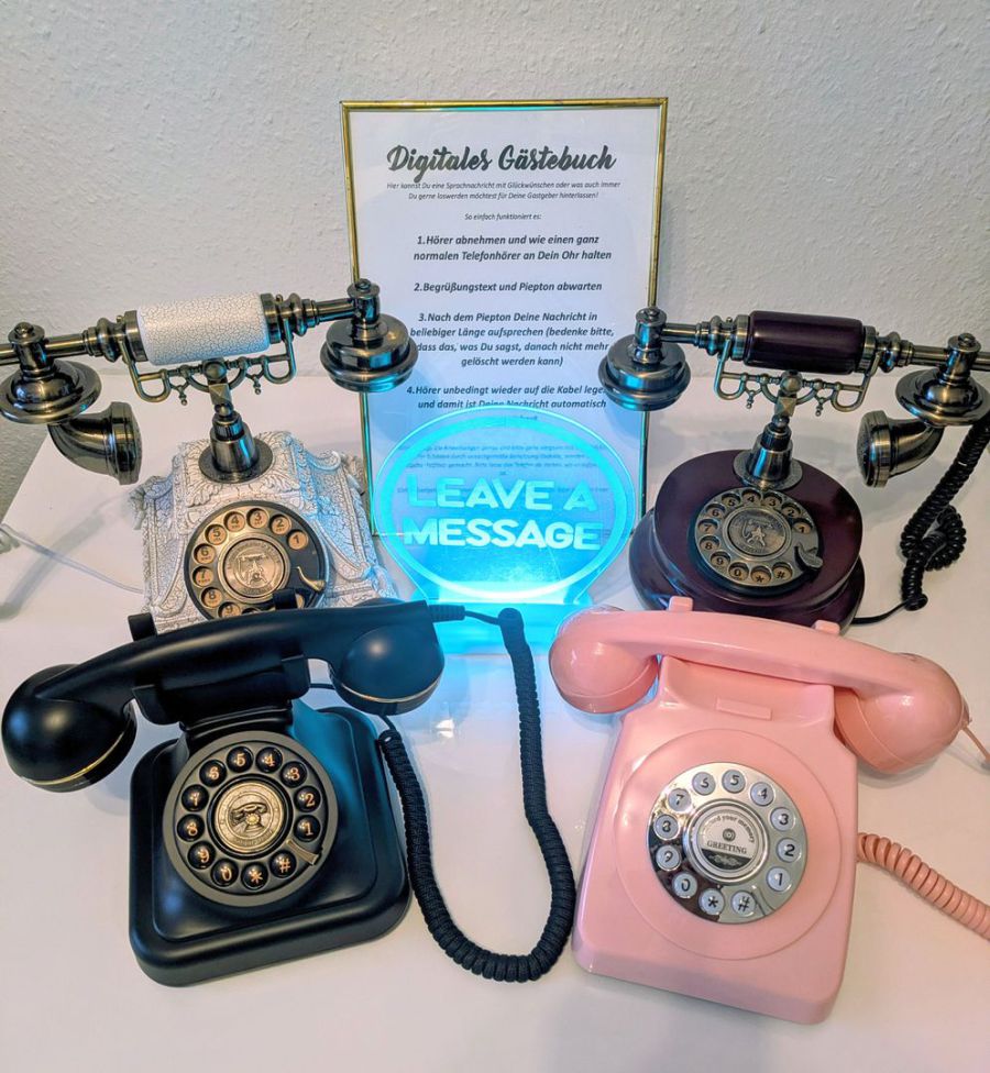 Das Prinzip ist denkbar einfach. Hörer abnehmen, Bandansage und einen Piepton abwarten. Danach spricht man eine Grußnachricht von beliebiger Länge in den Hörer. Ist man mit der Nachricht fertig, wird einfach der Hörer wieder aufgelegt. Dann ist die Nachricht automatisch gespeichert. Die Begrüßungsnachricht können wir, angepasst an Ihre Feier, vorab auf dem Wedding Phone hinterlegen oder Sie sprechen die Begrüßungsnachricht nach dem Aufbau des Weddig Phone kurz selber für Ihre Gäste drauf. Insgesamt können ca. 100 Stunden Nachrichten hinterlassen werden. Wird also sicher reichen.